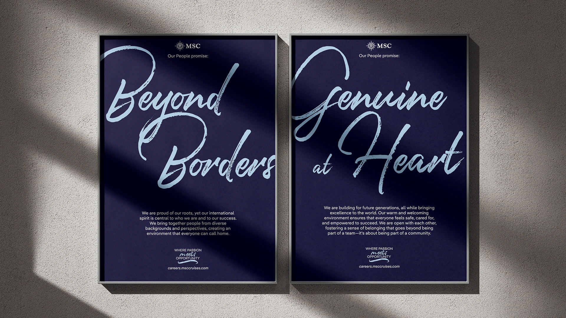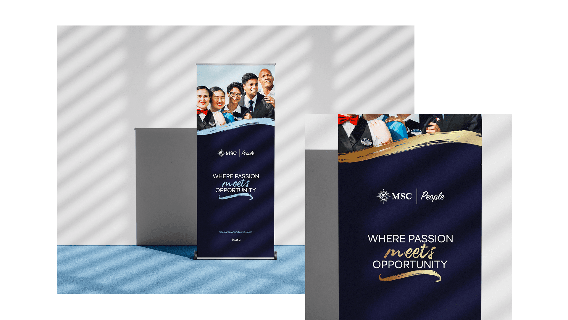 Alongside the film, we developed a bold visual identity for the EVP mantra and its pillars. Fully aligned with MSC’s brand guidelines, yet distinctive enough to stand on its own, the system reinforces the message: passion and opportunity meet here.